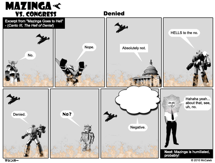 I was going to dedicate today's strip to Mazinga's one fan, Vijay Thomas (who also contributed a line of dialogue), but... the request was denied.