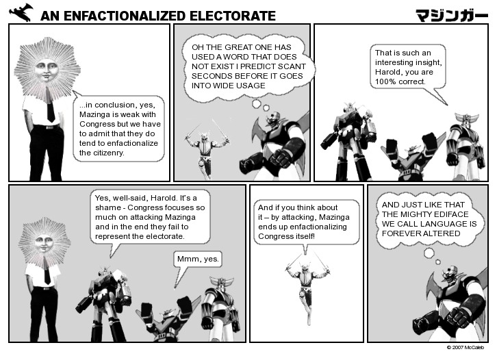 Other words auditioned for this Mazinga script: agreeance, ironical, expectational, entowards, supposebly. To my surprise ironical and expectational are actual words.